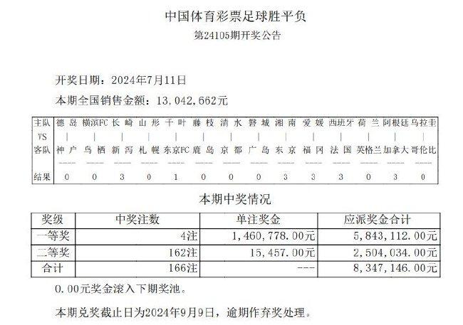 英格兰2-1绝杀荷兰北京时间7月11日,胜负彩第24105期开奖结果揭晓。本期一等奖开出4注,单注奖金1,460,778元,二等奖开出162注,单注奖金15457元;任九开出1899注4533元。本期胜负彩销量为13,042,662元,任九投注总额为13,450,910元。