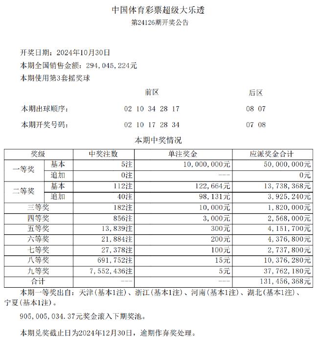 北京时间10月30日晚,体彩大乐透第24126期开奖,当期开奖号码为:前区02 10 17 28 34,后区07 08。