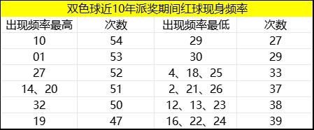结合近10年双色球派奖期间所有开奖数据,笔者总结了一注最热6+1。根据红球现身频率,10码现身54次热度最高,其次是01码和27码。红球出现次数超过50的一共6枚号码,即10、01、27、14、20和32,和近10年派奖期间最火的蓝球12组成一注6+1,即近10年派奖期间的最热奖号。