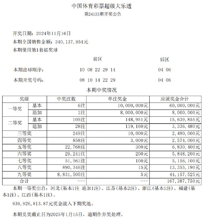 北京时间11月16日晚,体彩大乐透第24133期开奖,当期开奖号码为:前区08 10 14 22 29,后区04 06。