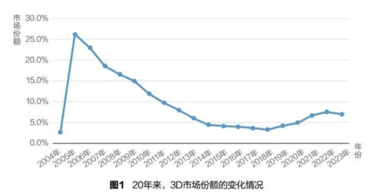 从3D的市场份额来看,2006年到2018年,其表现并不“平稳”。13年间,市场份额不断下滑,到2018年仅占3.3%,与2004年刚上市时的2.3%几乎相当。从2021年开始,3D的市场份额又开始逐步上升。