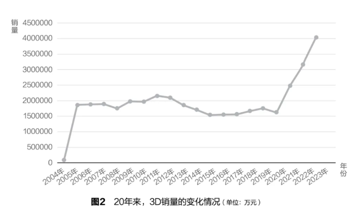 2021年到2023年,3D的期均销量分别为7039万元、9000万元、11517万元。今年截至10月15日,3D的期均销量为13141万元。这几年,3D的销量相比过往呈现明显的增长态势。