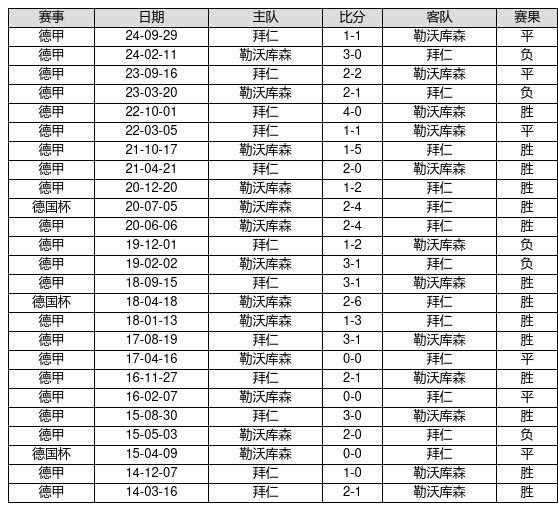 拜仁 VS 勒沃库森两队近10年的交战次数为25场,拜仁14胜6平5负,赢球概率为56.0%,平局概率为24.0%,输球概率为20.0%。