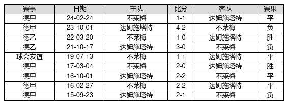 不莱梅 VS 达姆施塔特两队近10年的交战次数为9场,不莱梅2胜4平3负,赢球概率为22.2%,平局概率为44.4%,输球概率为33.3%。