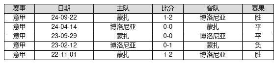 博洛尼亚 VS 蒙扎两队近10年的交战次数为5场,博洛尼亚2胜2平1负,赢球概率为40.0%,平局概率为40.0%,输球概率为20.0%。
