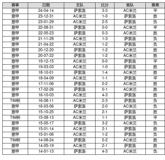 AC米兰 VS 萨索洛两队近10年的交战次数为26场,AC米兰13胜5平8负,赢球概率为50.0%,平局概率为19.2%,输球概率为30.8%。