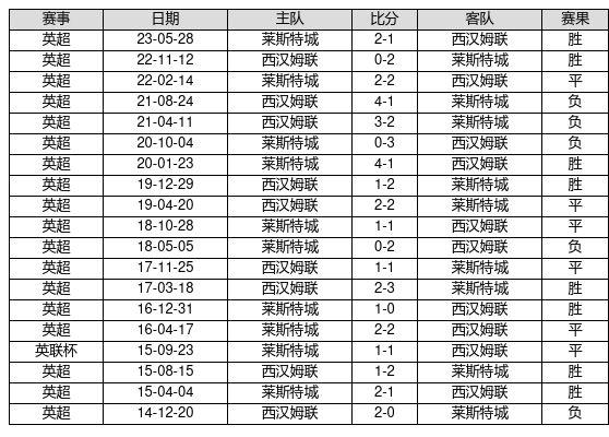 莱斯特城 VS 西汉姆联两队近10年的交战次数为19场,莱斯特城8胜6平5负,赢球概率为42.1%,平局概率为31.6%,输球概率为26.3%。