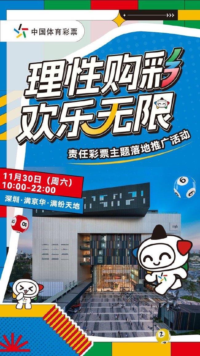 11月30日10:00-22:00(本周六),深圳体彩将在宝安区满京华·满纷天地(正门室外广场)与您相约,期待与您一同开启“理性购彩 欢乐无限”的精彩之旅,在欢乐的氛围中了解理性购彩理念,共同定格美好瞬间!