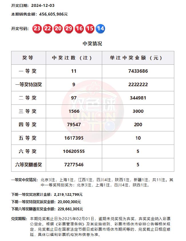 北京时间12月3日,福彩双色球第24139期正式开奖,同时也是双色球12亿大派奖活动的第14期。此次开奖的号码为红球15、16、20、22、23、29,蓝球14。本期共开出11注一等奖,其中9注获得一等奖特别奖,单注奖金为965万元,另外2注基本一等奖单注奖金为743万元。9注一等奖特别奖分布在北京(3注)、上海、四川(4注)、陕西,而2注基本一等奖分别落在江西和新疆。