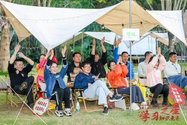 体验完非遗文化和互动环节后,参与者们在绿意盎然的营地中围炉煮茶,享受美食,通过“你画我猜”等趣味游戏热身,现场气氛热烈非凡。大屏幕还播放了深圳体彩的责任彩票MG动画科普视频——体彩小百科第七期:《拒绝诱惑,抵制非法彩票》,帮助参与者进行赛前“复习”。随后,当天的重头戏——责任彩票“知识竞赛”正式拉开帷幕,线上答题、限时PK、抢答对决,一环扣一环,不仅考验了选手们的知识储备,更展现了他们对责任彩票理念的深刻理解。