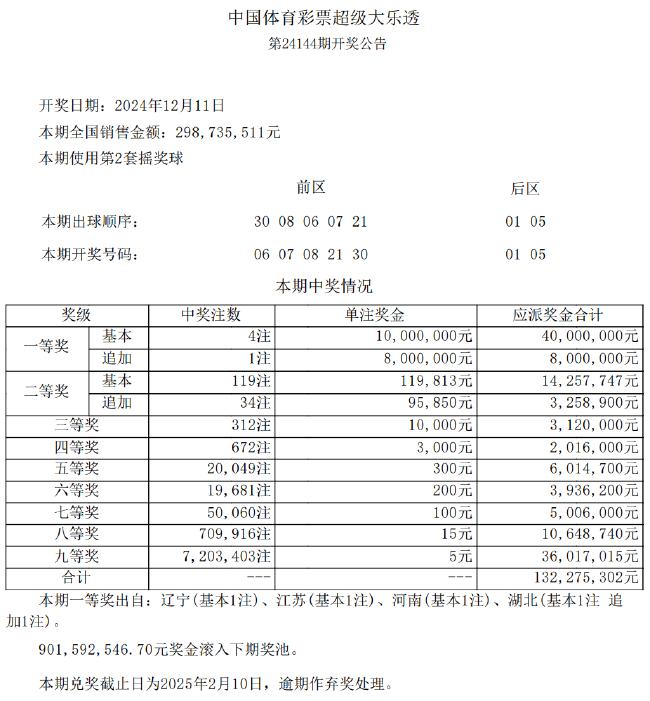 大乐透24144期开4注1000万 奖池9.01亿
