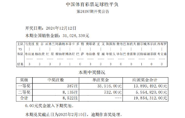 本菲卡0-0闷平博洛尼亚北京时间12月12日,胜负彩第24197期开奖结果揭晓,14场1等开出387注,单注奖金35,916元,14场2等开出8,135注,单注奖金732元;任九开出52,764注,单注奖金252元。本期胜负彩销量为31,026,330元,任九投注总额为20,816,642元。