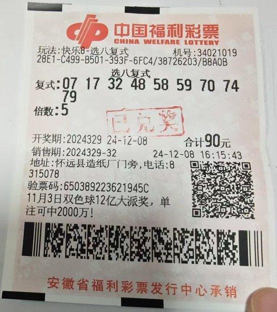 12月8日晚,福彩快乐8游戏2024329期开奖,蚌埠市怀远县34021019号福彩销售网点传来好消息。一位幸运彩民凭借一张90元的自选快乐8选八复式票,喜中选八中八5注、选八中七40注,总共赢得奖金282,000元。据了解,这位幸运彩民黄先生是福彩的忠实支持者,多年来一直购买彩票,业余时间经常购买双色球、快乐8和刮刮乐等彩票,但最钟爱的还是快乐8游戏,因为它玩法丰富,中奖的乐趣十足。开奖当天晚上,黄先生像往常一样登录中国福彩官网查看中奖信息,看到自己的彩票与开奖号码一一吻合,他简直不敢相信,反复核对几遍后才确认无误,随即与家人分享了这个喜讯。