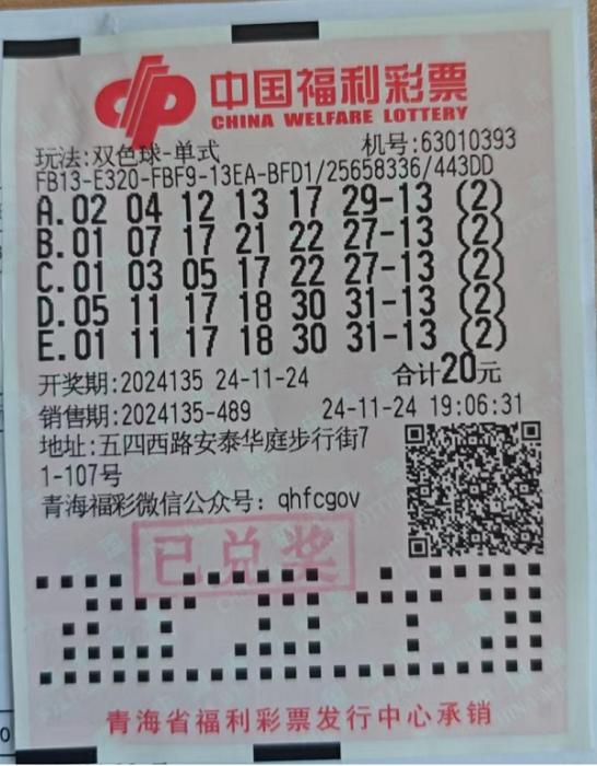 11月24日,福彩“双色球”第2024135期开奖中,青海省西宁市城西区五四西路安泰华庭步行街71-107号的一家彩站传来喜讯。该站的一位彩民凭借一张20元的自选票,幸运地收获了2注一等奖和2注一等奖特别奖,总奖金高达19389422元!