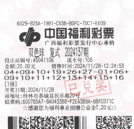 11月28日晚,双色球第2024137期开奖,开奖号码为红球04、09、10、19、26、27,蓝球12。本期全国共开出70注一等奖,每注奖金超过529万元,其中一注来自广西,由桂林恭城的一位幸运彩民中得。据了解,这注头奖出自桂林市恭城瑶族自治县民乐路20号的45041106号销售网点。该网点业主关先生表示,中奖彩票是一张投注金额为20元的“6+10”复式票,凭此票,该彩民不仅中得了1注529万元的头奖,还额外获得了1注一等奖特别奖34万多元,总奖金达到563万余元。
