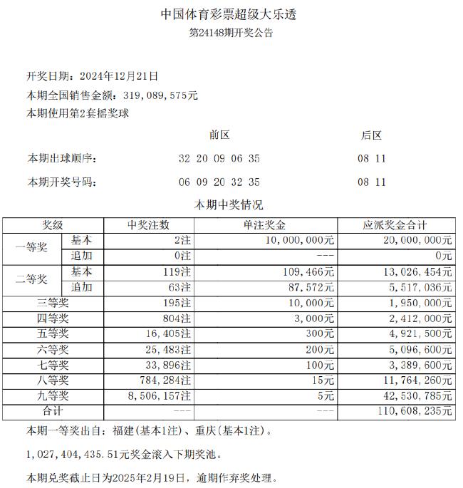 北京时间12月21日晚,体彩大乐透第24148期开奖,当期开奖号码为:前区06 09 20 32 35,后区08 11。