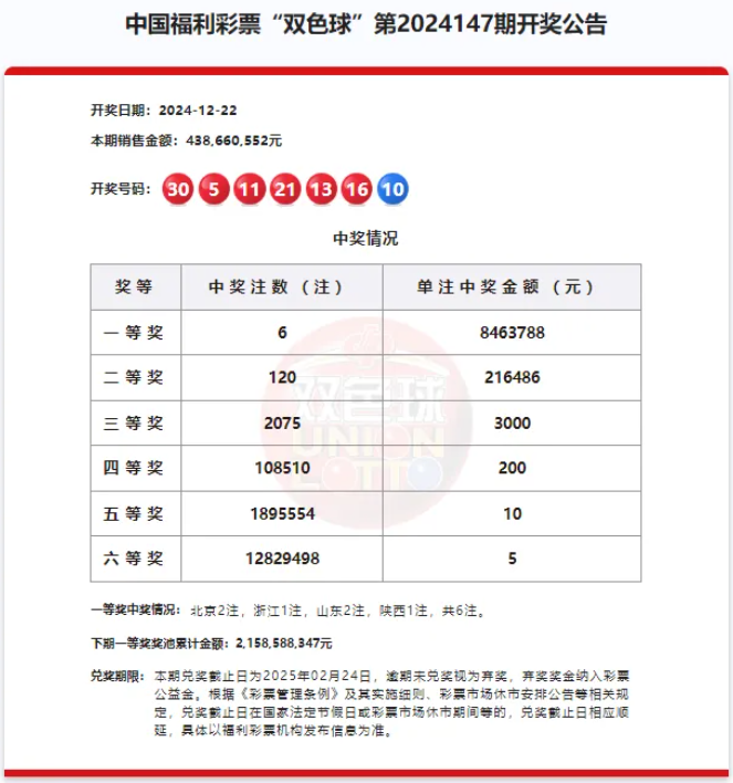 据悉,12月22日晚开奖的双色球第2024147期,全国共中出6注一等奖,每注奖金为8463788元,中奖地区包括北京(2注)、浙江(1注)、山东(2注)和陕西(1注)。其中,浙江的幸运彩民再次收获一等奖,这注大奖由绍兴的购彩者中得。此外,本期我省还收获了7注二等奖,每注奖金为216486元,具体分别为:宁波、温州各中2注,杭州、嘉兴、衢州各中1注。本期双色球总销量为4.38亿元,筹集公益金1.57亿元,奖池金额达到21.58亿元。