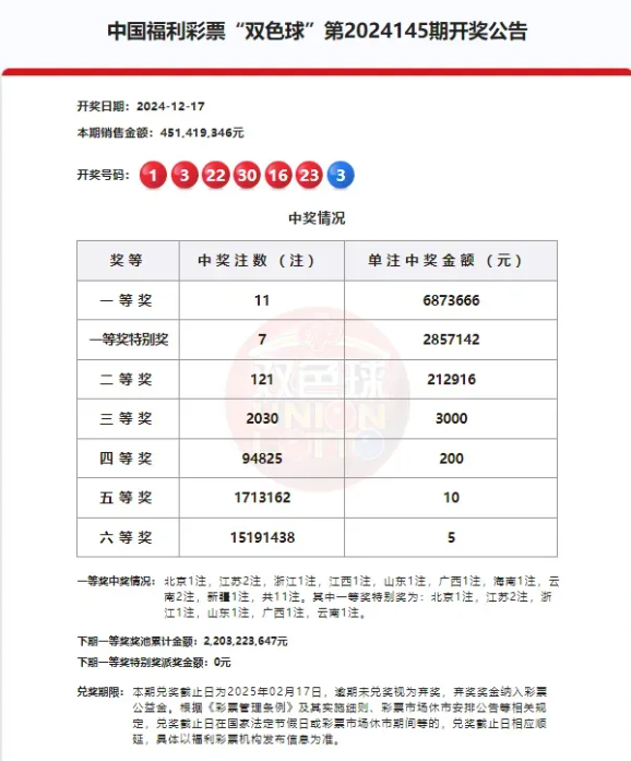 12月17日,双色球第2024145期的开奖结果揭晓,这也是今年双色球12亿元大派奖活动的最后一期。全国共中出11注一等奖,其中7注符合派奖条件,成功分享了2000万元的派奖奖金,平均每注多得285.7万元。剩余的4注一等奖未符合派奖条件,每注奖金为687.3万元,这4注大奖分别来自江西、海南、云南和新疆,每个省份中出1注。