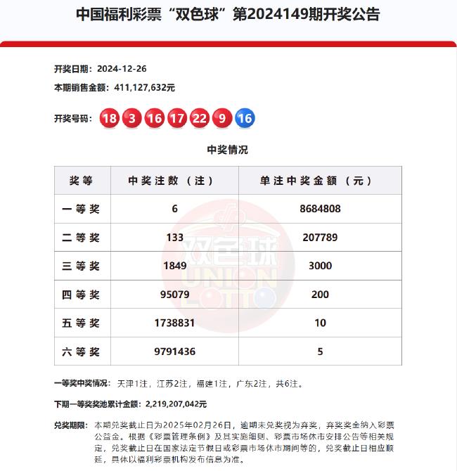 北京时间2024年12月26日,福彩双色球第24149期开奖,以下是详细开奖流程: