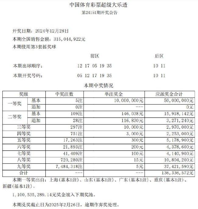 北京时间12月28日晚,体彩大乐透第24151期开奖,当期开奖号码为:前区05 12 17 19 35,后区10 11。