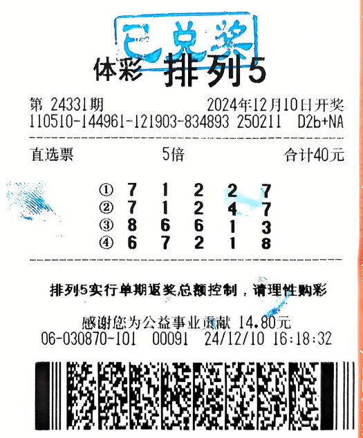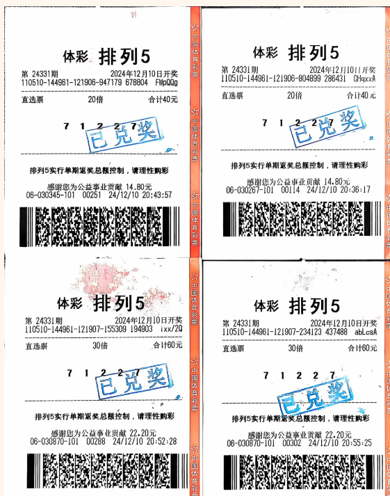 12月10日,体彩“排列5”第24331期的开奖号码为“71227”,全国共中出253注一等奖,其中德阳的张先生(化姓)幸运地中得其中的105注,总奖金高达1050万元。12月12日,张先生来到四川省体育彩票管理中心德阳分中心办理兑奖手续。工作人员得知,尽管张先生已经购买彩票多年,并且中过不少奖,但当超级大奖真的降临时,他依然感到无比激动。