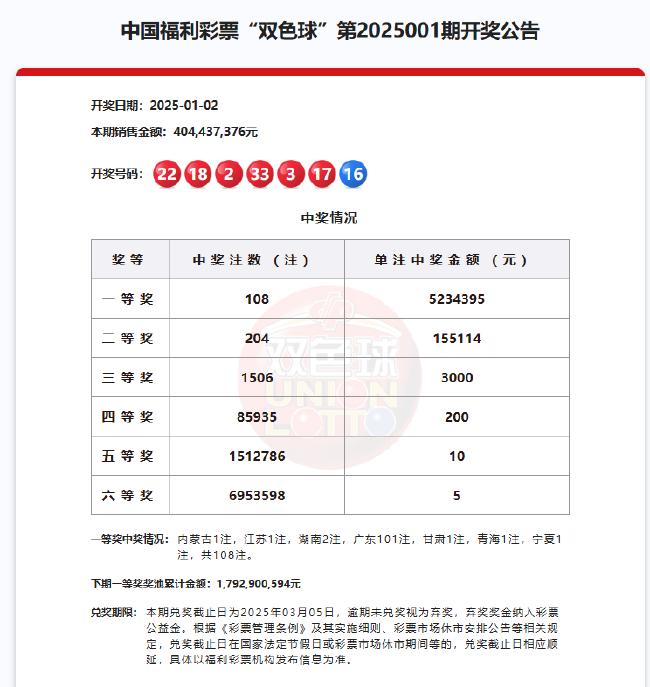 福彩开奖直播截图北京时间2025年1月2日,福彩双色球第25001期开奖,红球02 03 17 18 22 33,蓝球16。当期一等奖井喷108注,单注奖金523万余元。经新浪彩票确认,108注头奖分落全国7地,其中广东独揽101注一等奖;根据检索,101注头奖均出自广州第44010678站点,该彩站爆出双色球5.28亿元巨奖!