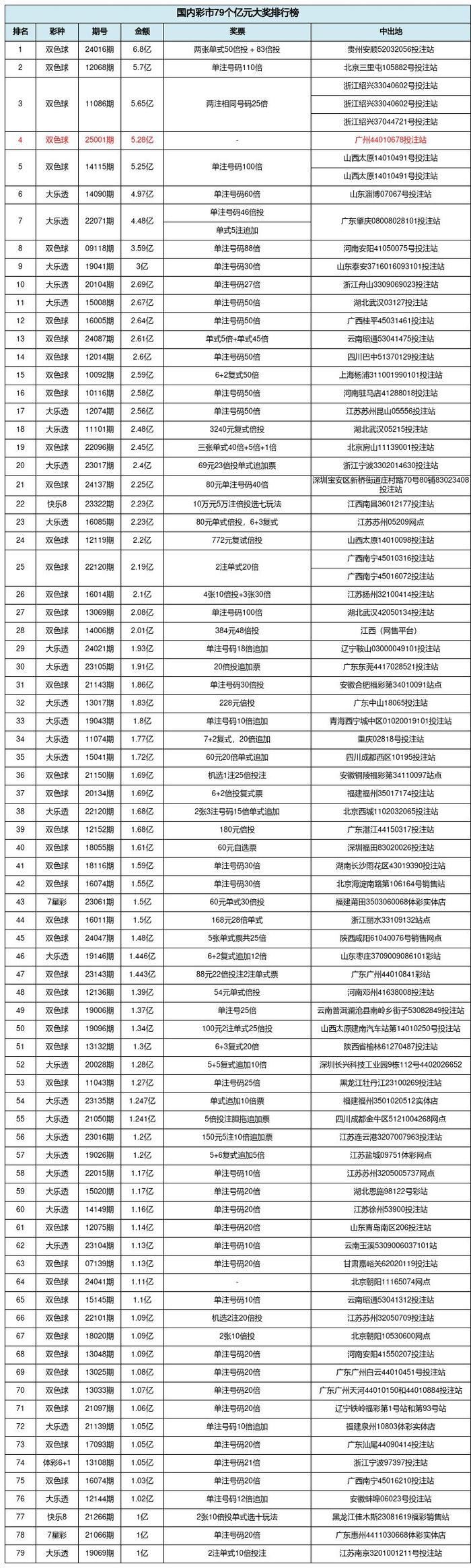 本次5.28亿巨奖,是福彩双色球游戏开出的第45个亿元奖,也是2025年双色球第1个亿元大奖,距离2024年11月28日晚深圳双色球2.25亿巨奖相隔35天。截止目前,本次5.28亿巨奖排名国内彩市亿元第4,也恰巧排名双色球亿元奖第4位,同时这也是国内彩市开出的第79个亿元奖!
