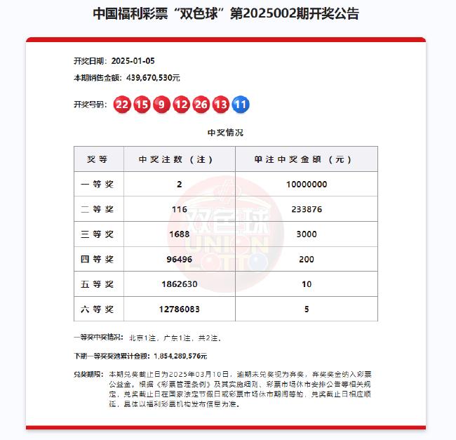 22:12 本期一等奖开出2注,单注奖金1000万元,2注头奖分落北京和广东。二等奖开出116注23.3万余元。本期双色球全国销量为4.39亿元,计奖结束后奖池余额为18.54亿余元。