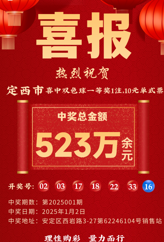 新的一年,好运降临!1月2日晚,福利彩票双色球第2025001期开奖,红球号码为:02、03、17、18、22、33,蓝球号码为16。当期全国共中出双色球一等奖108注,单注奖金超过523万元,其中一注被定西市彩民摘得。这也是2025年定西市的首注双色球头奖,给当地彩市带来了新年开门红。大奖出自安定区西岩路3-27的第62246104号福彩投注站,附近有一个广场,平时人流量较大。根据销售员成先生的介绍,前来买彩票的主要是附近的居民,老彩民居多,也有不少路过的彩民光顾。成先生提到,1月3日早上,他清洁完店内卫生后,打开投注机查询开奖公告,得知自己店里中了大奖,便立刻在店门口挂起了中奖条幅,吸引周围的居民前来沾喜气。随后,很多前来的彩民询问中奖情况,成先生笑着说:“我现在还不知道是谁中奖了,但无论是谁,我都替他感到高兴。”