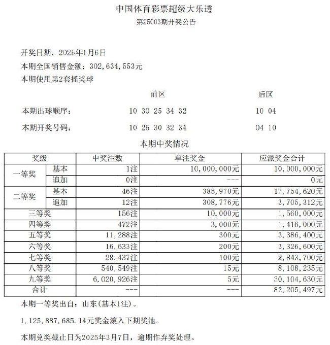 北京时间1月6日晚,体彩大乐透第25003期开奖,开奖号码为前区10、25、30、32、34,后区04、10。本期开出1注一等奖,单注奖金为1000万元,未进行追加,中奖票落户山东。二等奖共开出46注,单注奖金约38.5万元,其中12注进行了追加投注,每注奖金额外增加约30.8万元。本期全国销量达3.02亿元,奖池余额达到11.2亿元,将滚存至1月8日(周三)开奖的第25004期。