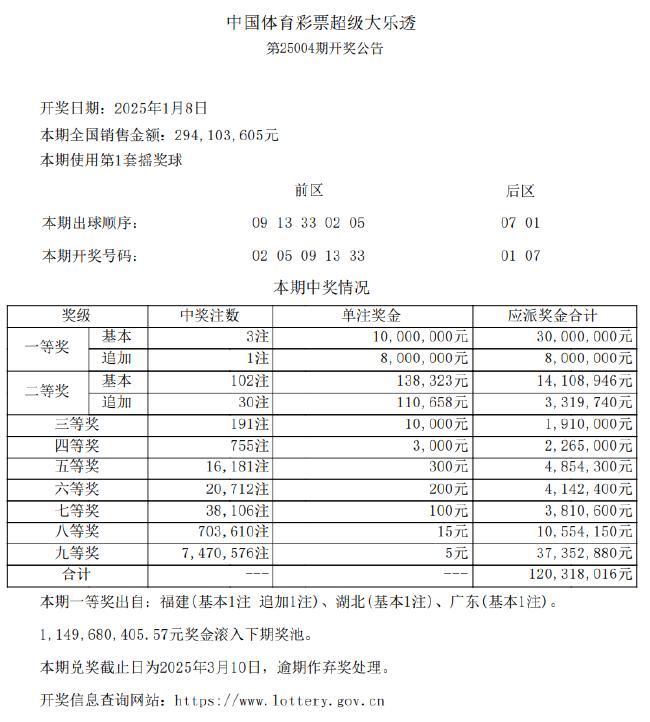 北京时间1月8日晚,体彩大乐透第25004期开奖,开奖号码为前区02、05、09、13、33,后区01、07。本期共开出3注一等奖,每注奖金为1000万元,其中1注为追加投注,奖金增加至800万元,且该注追加头奖出自福建;另外2注基本投注一等奖分别落户湖北和广东。二等奖方面,本期共开出102注,单注奖金超过13.8万元,其中30注为追加投注,每注额外收获约11万元奖金。本期全国销量达到2.94亿元,奖池余额为11.49亿元,将滚存至1月11日(周六)开奖的第25005期。