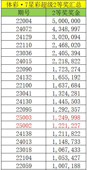 从第20100期开始,7星彩实施了新规则,根据小编的统计,7星彩至今开出19个超级2等,而2025年开局阶段能够连续2期开出超级二等奖,这也是7星彩第2次出现连续2期开出超级二等。今晚第25004期依旧在3.01亿奖池下有机会继续开出百万级别的超级二等奖。