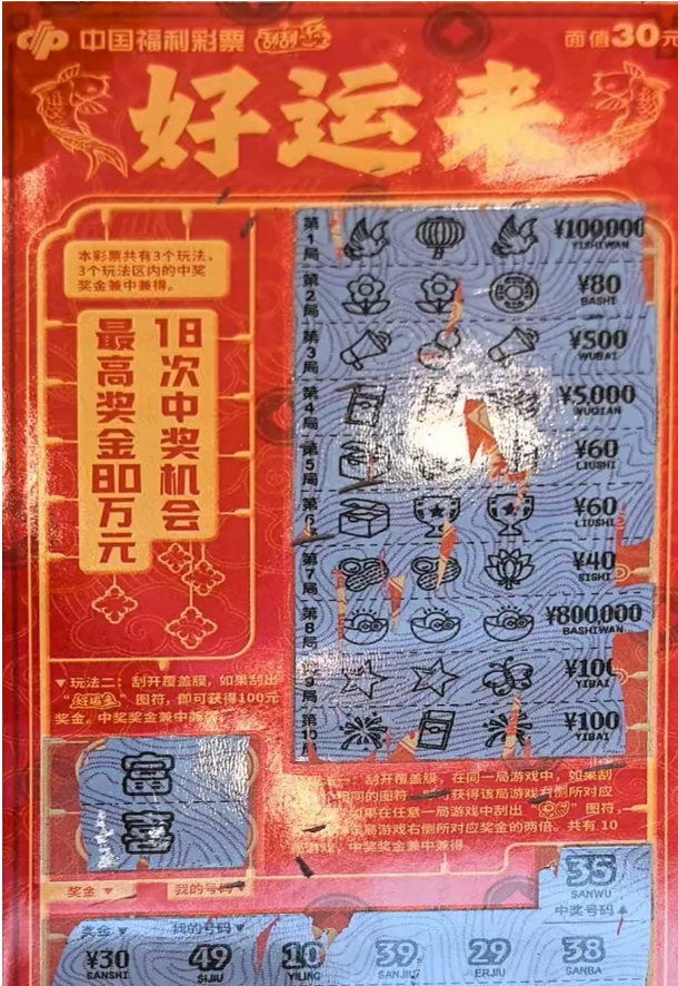 宝应一位年轻男子刮出了“好运来”彩票的80万元头奖