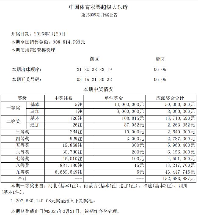 2025年1月20日晚,体彩大乐透第25009期开奖,开奖号码为:前区03 19 21 30 32,后区06 09。本期共开出5注一等奖,单注奖金为1000万元,其中1注为追加投注,奖金增加至1800万元,出自内蒙古;另外4注基本一等奖分别分布在福建(2注)、河北和四川(各1注)。二等奖开出126注,每注奖金为10.8万余元,其中26注为追加投注,每注额外获得8.7万余元奖金。本期全国销量为3.08亿元,奖池余额12.07亿元,将滚存至2025年1月22日(周三)开奖的第25010期。
