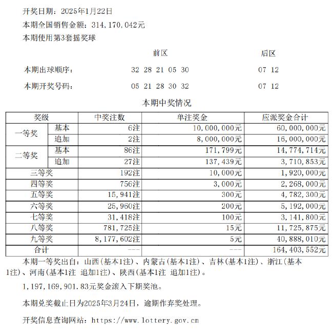 本期开出6注一等奖,单注奖金1000万元,其中2注选择追加,多得奖金800万元,2注1800万追加头奖分落河南、陕西,4注基本头奖出自山西、内蒙古、吉林、浙江。二等奖开出86注,单注奖金17.1万余元,其中27注采用追加投注,每注多得奖金13.7万余元。本期全国销量为3.14亿元,奖池方面,11.97亿余元滚存至1月25日(周六)开奖的第25011期。