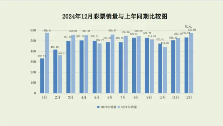 1-12月累计,全国共销售彩票6234.86亿元,同比增加437.90亿元,增长7.6%。其中,福利彩票机构销售2079.56亿元,同比增加135.15亿元,增长7.0%;体育彩票机构销售4155.30亿元,同比增加302.75亿元,增长7.9%。
