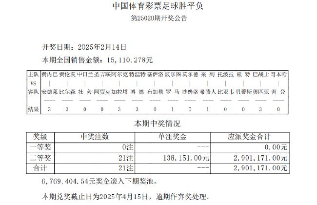 莫尔德0-1沙姆洛克北京时间2月14日,胜负彩第25020期开奖结果揭晓。本期一等奖空开,滚存6,769,404.54元。二等奖开21注138,151元;任九开382注31,764元。本期胜负彩销量为15,110,278元,任九投注总额为18,959,520元。