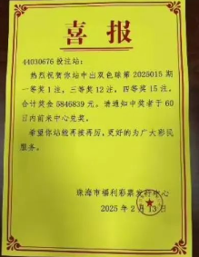 喜讯!昨晚,珠海井岸西埔的彩民喜中双色球一等奖,奖金高达5846839元!此次中奖方式为复式8+12月13日晚举行的中国福利彩票双色球第2025015期开奖。