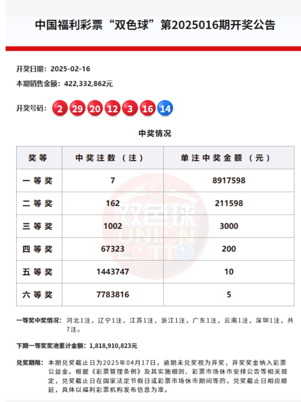 2025年2月16日晚,中国福彩网更新了开奖公告,双色球开出了7注一等奖,每注奖金接近900万元。根据中国福彩中心的数据,本期一等奖单注奖金为8,917,598元,二等奖每注奖金为211,598元。在曲靖市麒麟区金宝路临街商铺116号的彩票销售点(站点号53021845),幸运地诞生了一位超级幸运儿。该彩票以复式倍投方式,精准命中2025016期的双色球一等奖1注和二等奖15注,税前总奖金高达12,091,568元。