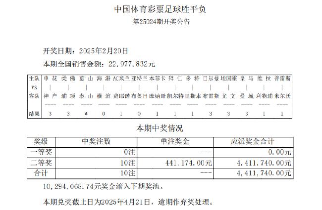 多特造4倍冷平北京时间2月20日,胜负彩第25024期开奖。亚冠赛场,因山东泰山退赛,该场比赛无效。根据《中国足球彩票发行与销售管理办法》第三章第十三条规定,该比赛将按照310全对赛果计算。