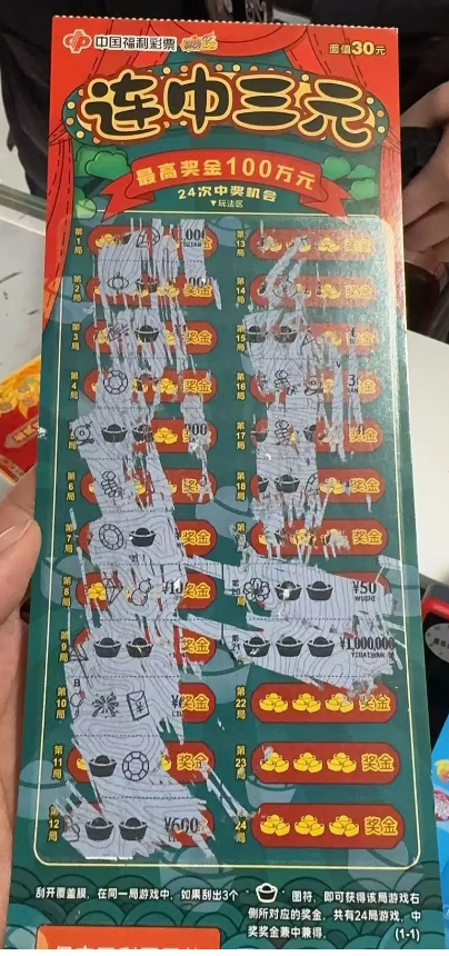 刮刮乐“连中三元”头奖100万!好运连连,福气不断。在西安幸运购彩者刮出“66顺88发”头奖25万后,西安又迎来新一轮大奖!另一位幸运购彩者刮中“连中三元”头奖100万!据悉,这张中奖彩票于2月18日下午18时左右,由位于雁塔区延兴门一路与新安路交叉口向西50米的第61011540号福彩投注站售出,面值为30元的“连中三元”刮刮乐。幸运购彩者一举夺得100万大奖!