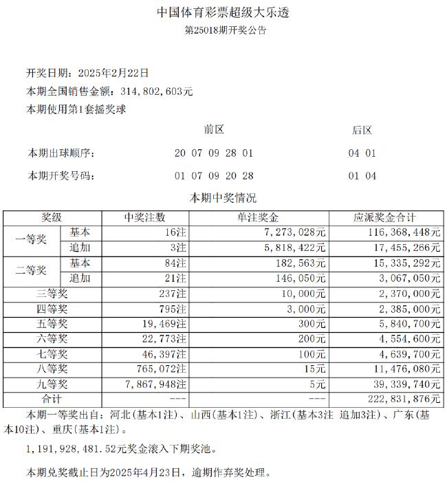 北京时间2月22日晚,体彩大乐透第25018期开奖,当期开奖号码为:前区01 07 09 20 28,后区01 04。