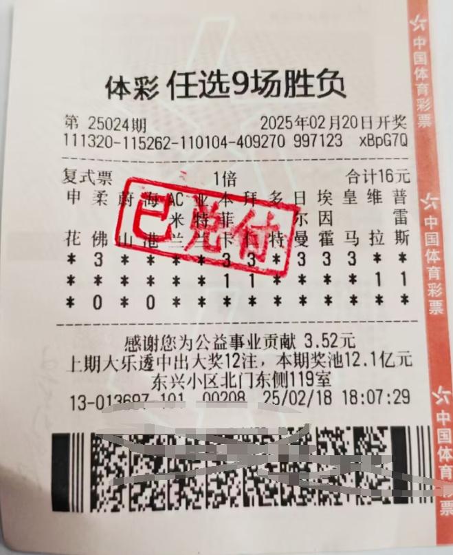 2月20日,体彩任选9场胜负游戏第25024期开奖,宿迁市沭阳县3213013697网点传来好消息,购彩者黄先生凭借一张16元的复式票,成功中得一等奖1注,奖金118,333元。黄先生是一位资深球迷,业余时间喜欢深入研究球队动态和赛事数据,尤其擅长捕捉冷门。他已热衷体彩任选9场和14场胜负玩法近十年,并始终坚持通过技术分析和理性投注来购彩。这次他在深思熟虑后,果断选择了多场平局和弱队逆袭的组合,最终凭借这些独到的判断,他幸运地获得了大奖。尽管中奖,黄先生依然保持理性心态。他表示,部分奖金将用于继续支持体彩的公益事业,其余款项将存入银行进行稳健理财,未来用来适度改善生活条件。