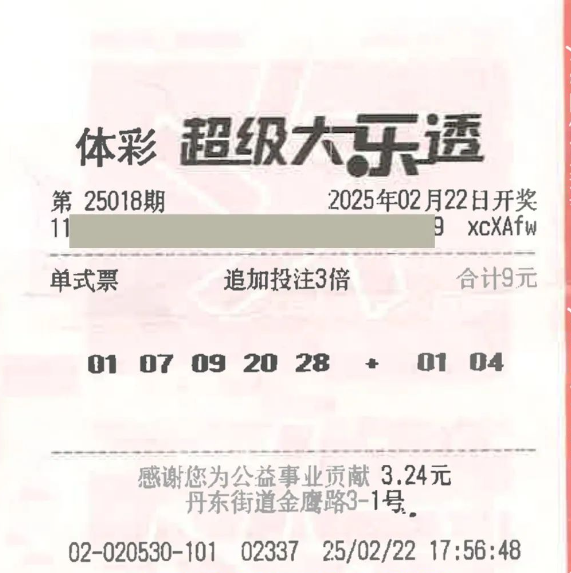 2月22日,体彩大乐透第25018期开奖,开奖号码为前区01、07、09、20、28,后区01、04。当期全国共中出16注一等奖,销售总额为3.14亿元,为国家筹集了1.13亿元的公益金。