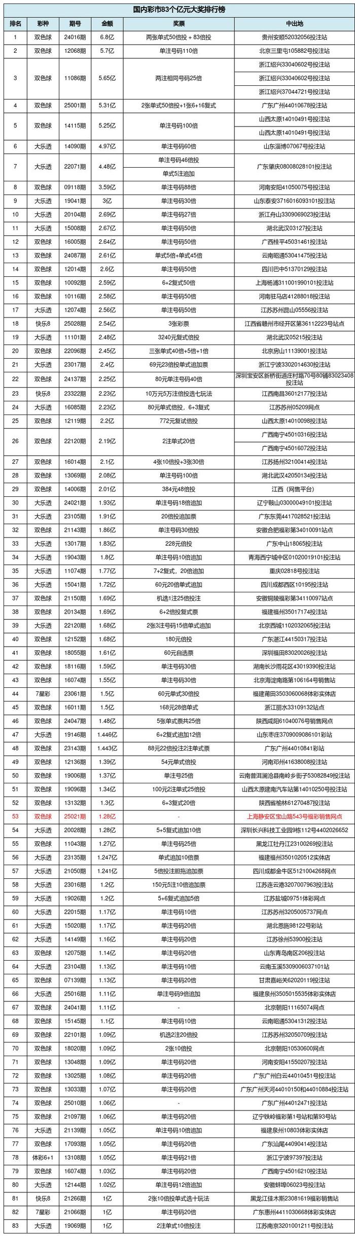 亿元巨奖回顾 上海静安双色球1.28亿排名53