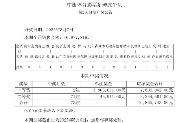 北京时间3月7日,足彩第25034期开奖结果公布。本期一等奖共开出2注,每注奖金为3,803,031元;二等奖开出71注,单注奖金为45,911元;任九奖金开出562注,每注奖金为23,525元。本期足彩总销量为16,977,818元,任九投注总额为20,657,910元。
