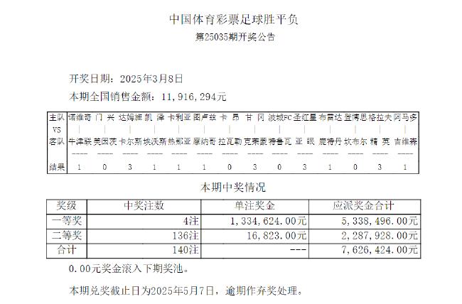 北京时间3月8日,足彩第25035期开奖结果公布。本期一等奖开出4注,每注奖金1,334,624元,二等奖开出136注,奖金为16,823元,任九开出1459注,奖金为7,358元。本期足彩销量达到11,916,294元,任九投注总额为16,775,860元。在足彩结果方面,本期最大冷门出现在英冠比赛中,诺维奇1-1战平牛津联,爆出了4倍冷平。此外,德乙凯泽斯劳滕、意甲卡利亚里、法甲摩纳哥、荷甲布雷达和葡超阿马多拉也都打出了平局;法乙卡昂以0-1不敌拉瓦勒,形成超3倍冷门;其他场次中,美因茨、达姆施塔特、甘冈、特鲁瓦、红星、坎布尔和格拉夫夏均顺利取胜,按照常规结果走。
