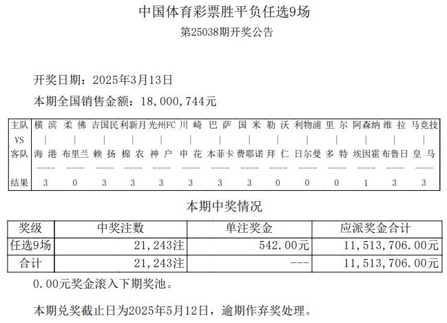 任九开奖北京时间3月13日,胜负彩第25038期任九开奖结果揭晓。本期任九开出21,243注,单注奖金542元。本期任九投注总额为18,000,744元。