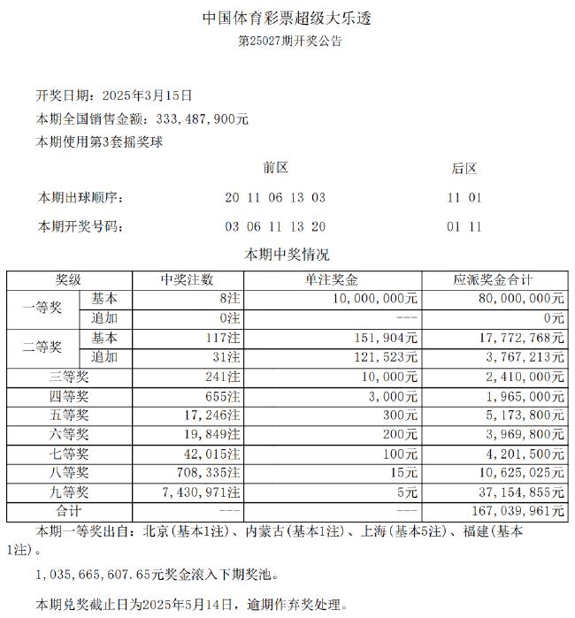 北京时间3月15日晚,体彩大乐透第25027期开奖,当期开奖号码为前区03 06 11 13 20,后区01 11。