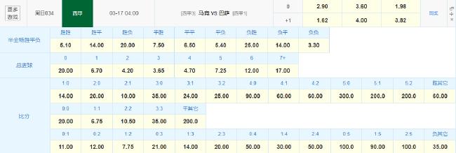 竞彩官方给本场西甲榜首大战开出2.90(马竞胜)、3.60(平局)、1.98(巴萨胜)胜平负组合,对于西甲领头羊巴萨给予今年以来17场不败出色的状态题材数据支撑。比分竞猜玩法方面,双方1-1战平比分赔率最低为1赔6.75,巴萨客场2-1赢球为1赔7.75紧随其后,马竞主场2-1赢球为1赔10.00,双方2-2战平为1赔10.50,巴萨客场1-0和2-0取胜分别为1赔11.00和12.00,整体来看对于巴萨略有优势倾向。